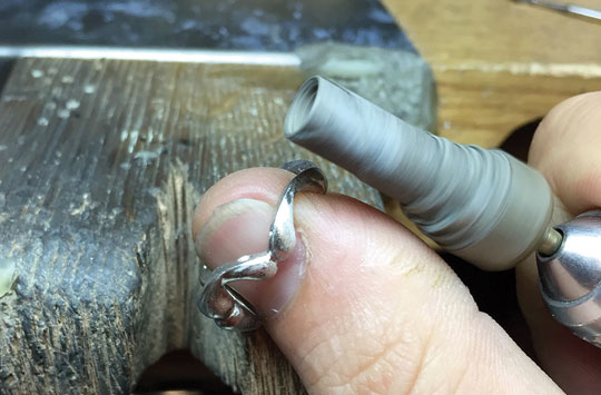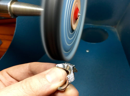 With our pieces assembled and our stones all set we can then begin putting the desired finish or polish onto our Jewel. There are various techniques and tools that can be used to achieve our finish, and almost all involve the use of multiple abrasive compounds. By using these compounds in order from coarsest to finest we can achieve anywhere from a dull satin finish all the way up to a glimmering high polish.