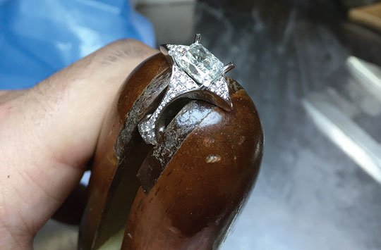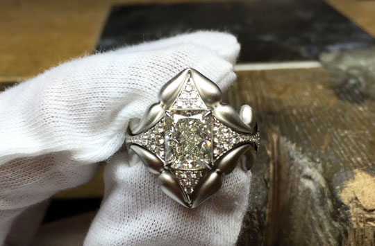 A great deal of care and time will go into this process. Precise measurements of the stones will be taken and then those stones will be meticulously set into our Jewel. This is all done with the use of a microscope to ensure that not only every stone is set as close to one another as possible, but that they are all set on the same level and plane as well.