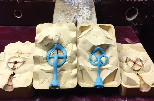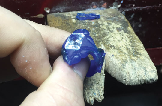 With the sprues now attached to our model we can proceed with the making of a mold. This mold will be made by enclosing the model with either liquid silicone or heated rubber. Once solidified the mold will then be carefully cut apart and our model will be removed. The resulting cavity will then be injected with liquid wax to produce exact replicas of our model. These waxes will then be taken and casted into the desired metal that will eventually become our Jewel.